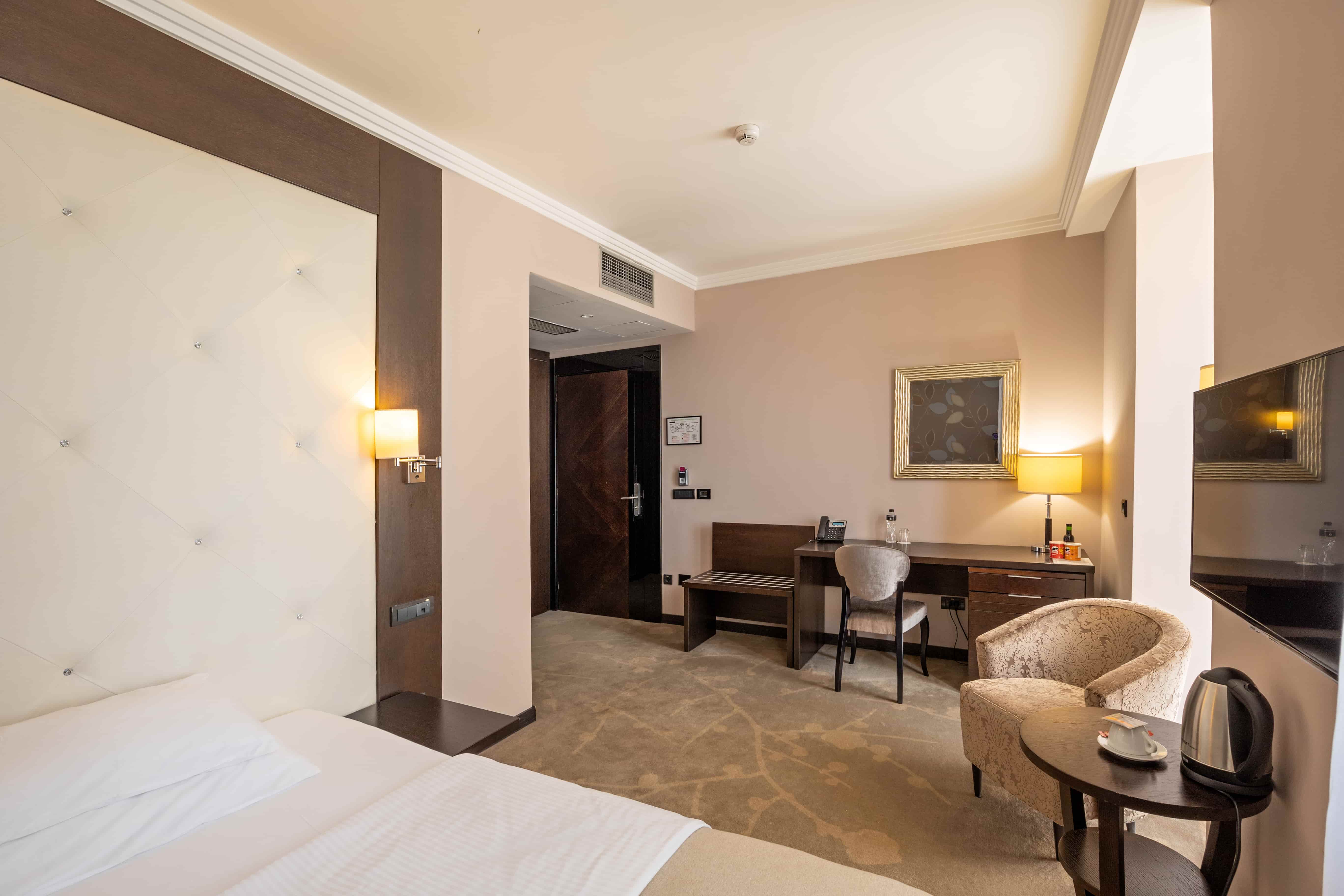 Ova jednokrevetna soba (25m2) je klimatizovana i ima prostor za sedenje, mini-bar i LCD TV sa satelitskim kanalima. Moderno kupatilo ima bade mantil, fen za kosu i bide.